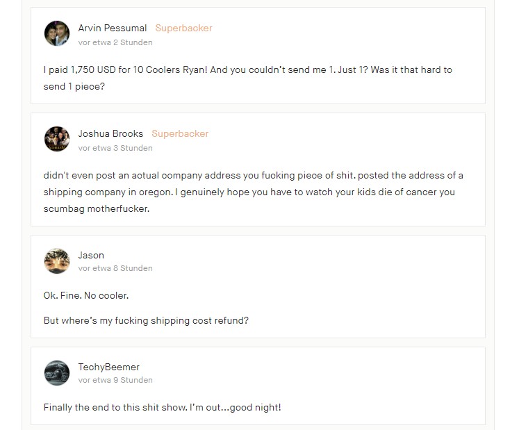 Die Betroffenen sind naturgemäß nicht erfreut. Auf der Kommentarseite des Kickstarter-Projekts – ein Update gab es hier zuletzt im März 2018 – wurden mittlerweile 22.000 Postings verfasst. Seit geraumer Zeit hagelt es dort bereits Kritik aufgrund der Probleme und Verzögerungen.