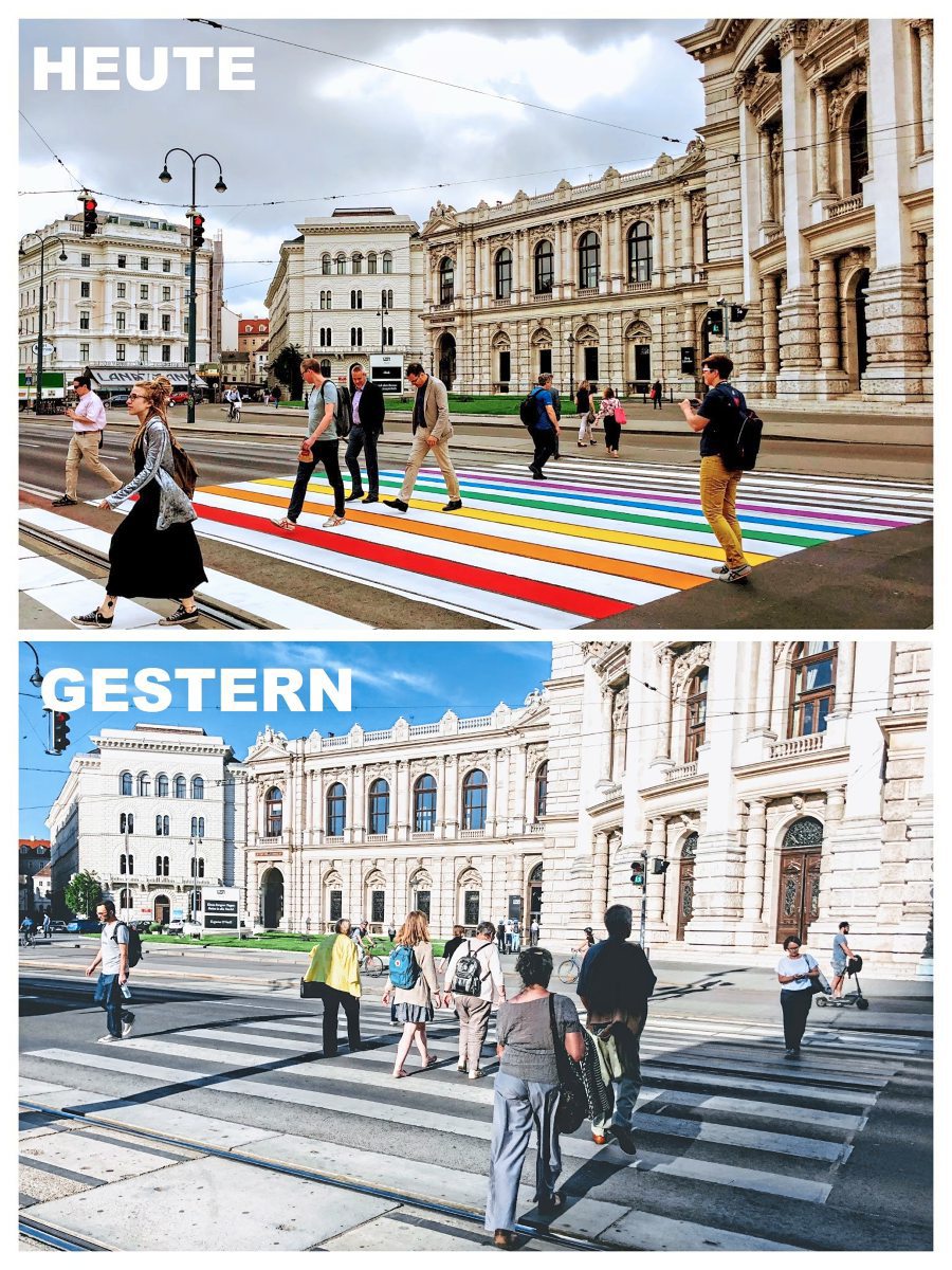 Im Vorfeld der Euro Pride setzte die Stadt über Nacht ein Zeichen für Weltoffenheit: Auf dem Ring gibt es jetzt einen Regenbogenzebrastreifen
